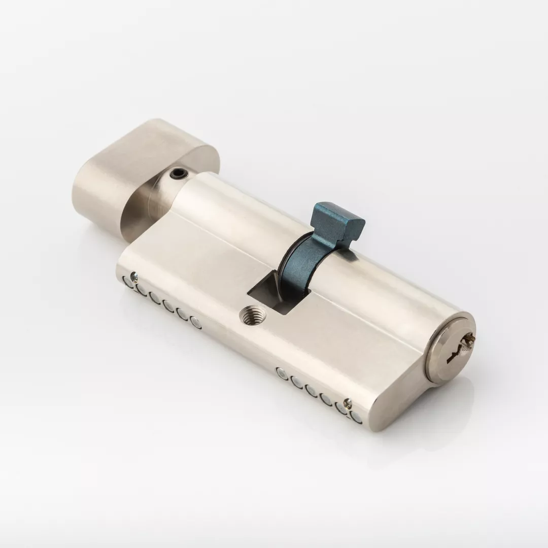 Solid brass euro profile cylinder with five internal pins: each cylinder is pinned, built, and finished by hand. Operated by a key on one side and a thumb turn on the other side.